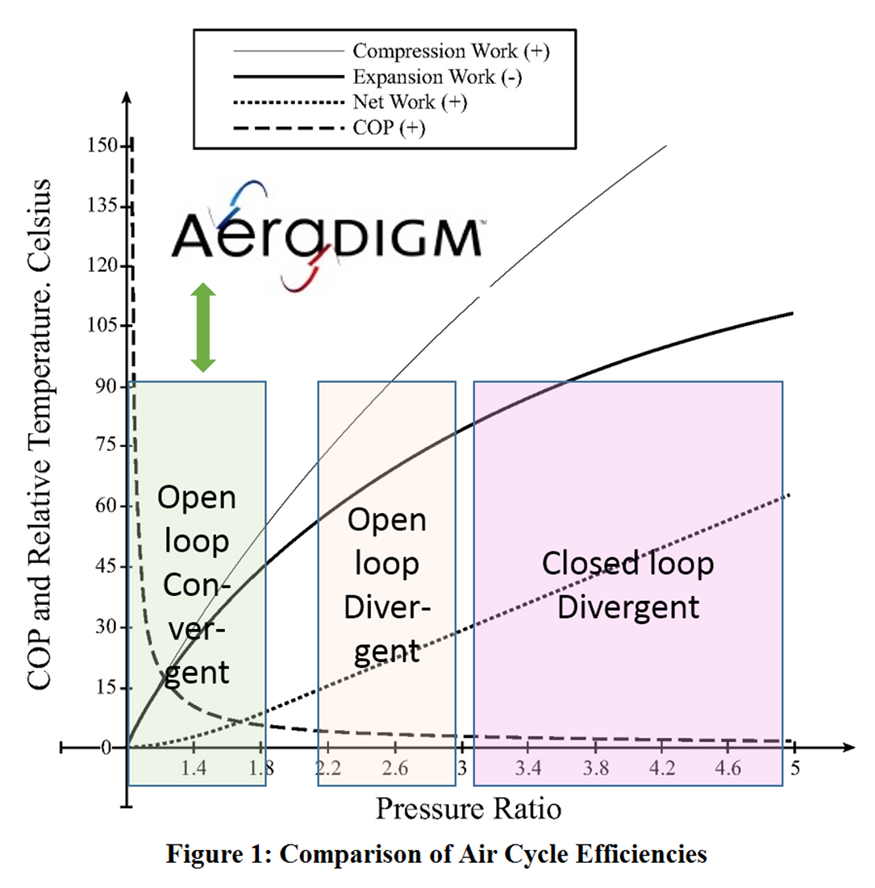 AeraDIGM replaces fans with pumps. Using the same mass flow of air required by a vapor-compression system as the refrigerant itself, what was a “loss” for a compressor becomes a “gain” in refrigeration. And thermodynamic efficiency (COP=Heat moved/Work required) skyrockets as pressure ratios are reduced.(More info)